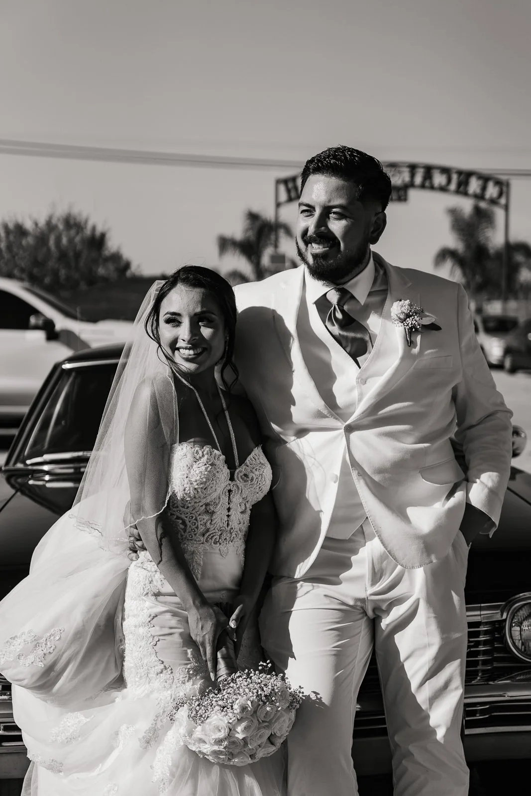 A moment where the couple is enjoying time together in a vintage car that was used at the reception for photo-op.
